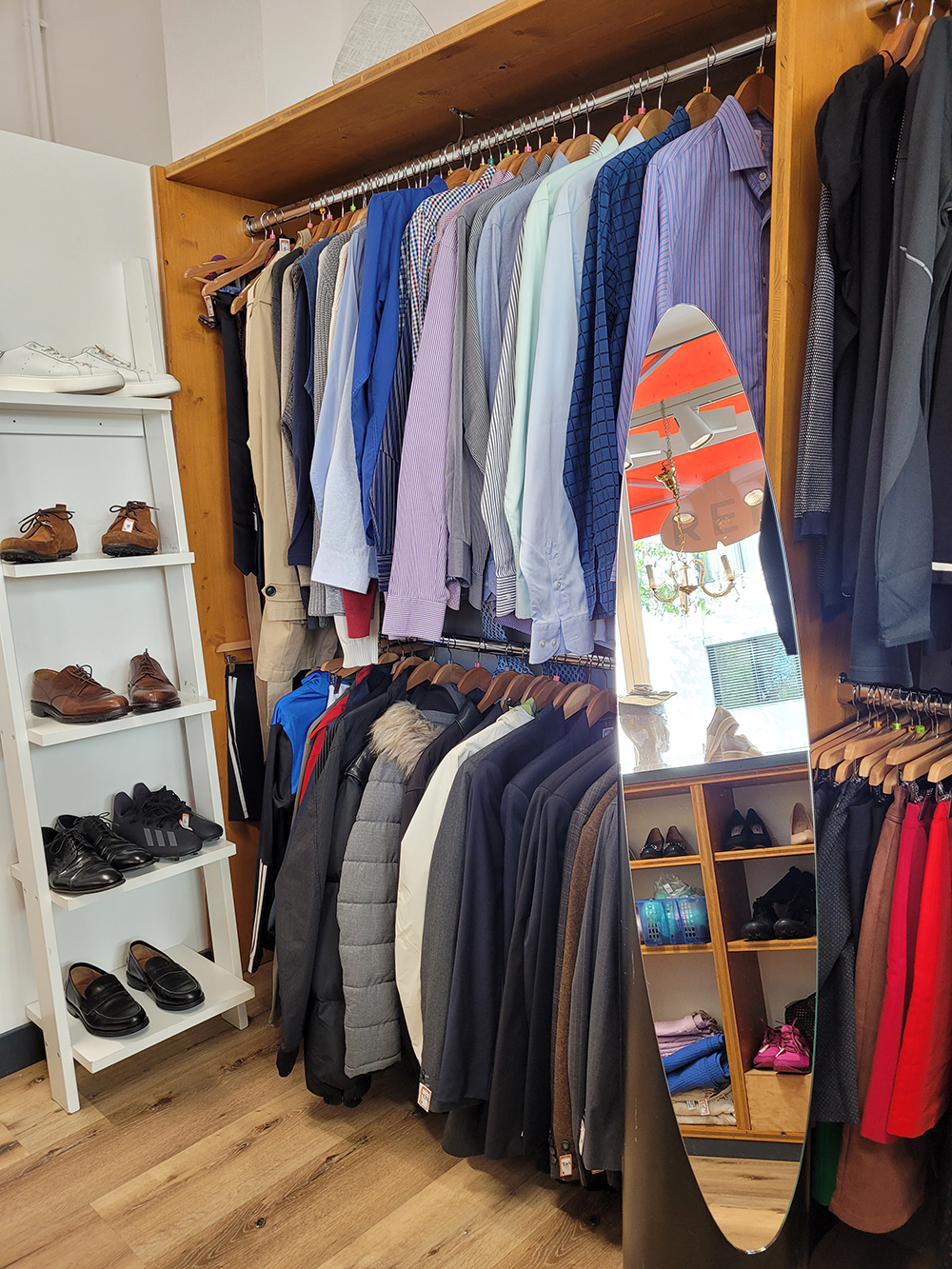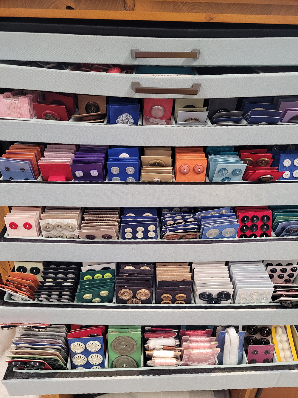 Une particularité de la boutique est son espace mercerie qui rassemble une magnifique collection de centaines de boutons en tout genre, rangés soigneusement et avec amour par couleur par une bénévole de la boutique. 🧵